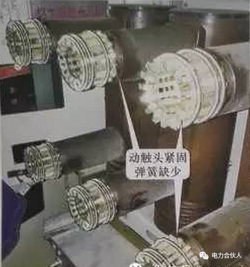 經專業人員檢查,確定母線室和后下柜無發熱開關柜,手車甲、乙相母線側動、靜觸頭和甲相下動、靜觸頭的觸頭部分發熱。開關柜電源故障檢查:將手車拉出機柜。發現一個壓縮彈簧在手車的a相母線側(上部)上的移動觸點的端部缺失,并且一個壓縮彈簧在手車的a相母線側上的下移動觸點的導電桿和b相母線側上的移動觸點的絕緣外殼側缺失(見圖17)。當檢查手車的靜態接觸情況時,發現下落的壓縮彈簧留在相應的靜態接觸盒中(見圖18)。
