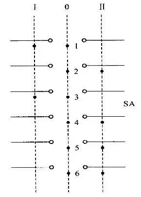 當手柄轉到不同檔位時,每個觸點的開關狀態由黑點表示,黑點表示觸點閉合,無黑點表示觸點斷開。